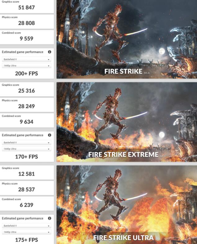 3DMark Fire Strike测试,是模拟基于DirectX 11 API的游戏,将电脑在运行AAA游戏时的表现以分数化来评断。而3DMark Fire Strike、Extreme与Ultra分别在1080P、2K与4K分辨率下运行。Radeon RX 6800 XT GAMING OC 16G在图形分数上分别获得51874、25316与12581分的显卡分数。