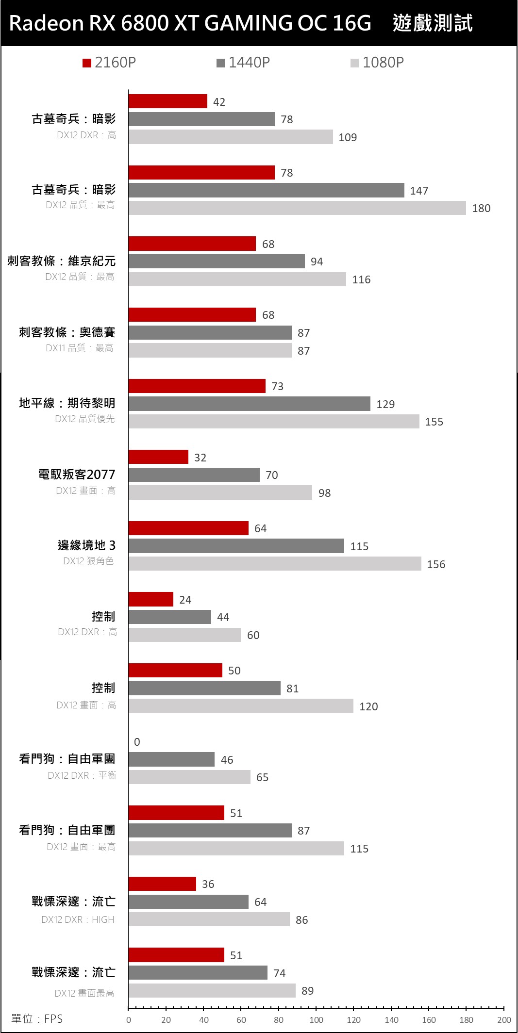 就结果而言,不计算开启光线追踪后的成绩,Radeon RX 6800 XT GAMING OC 16G基本上都能在4K分辨率与游戏预设的最高画质上,除了优化较差的几款游戏外,都能达到超过60帧的及格线,尤其是「A粉游戏」《刺客教条》系列,无论是旧款的《奥德赛》或最新的《维京纪元》,RX 6800 XT表现出来的成绩更是令人眼睛一亮。
