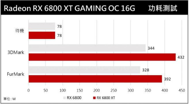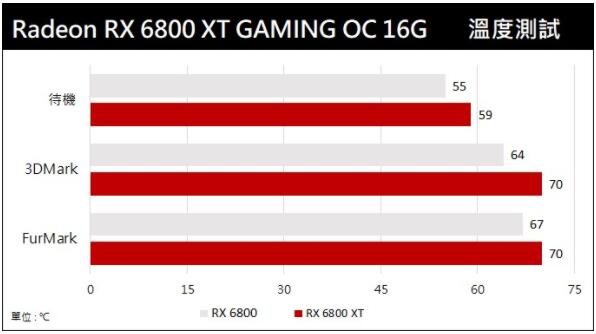 因为显卡有半被动式的风扇控制系统,当显卡温度或附载较低时,风扇会停止转动,达到0噪音的效果。因此在一般待机状况下Radeon RX 6800 XT GAMING OC 16G温度在59度。而在FurMark单烤烧机下,显卡温度在70度。而模拟游戏的3DMark压力测试中,显卡温度也维持在70度。