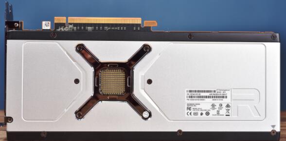 显卡背面则有着金属背板与内部的框架强化电路板与整体强度,由于这代RX 6000系列有着较高的GPU Boost时脉,因此GPU后方的电容元件可说是相当密集。