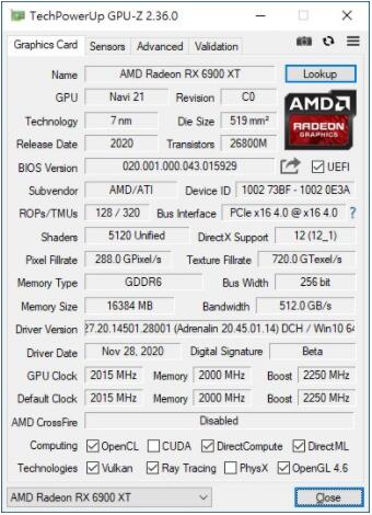 GPU-Z已可检视AMD Radeon RX 6900 XT的信息,采用7nm制程的Navi 21 GPU,RX 6900 XT有着5120个渲染核心,以及相当高的GPU基准时脉2015 MHz、Boost时脉更达2250 MHz;以及16GB GDDR6內存。