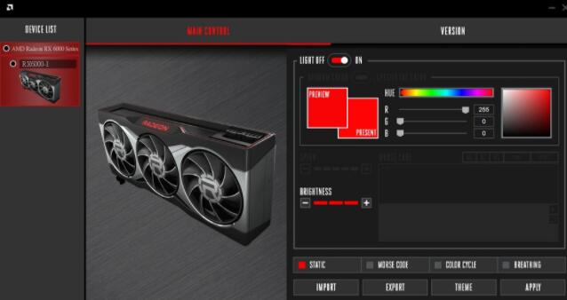 RX 6800 XT与RX 6900 XT的公版显卡灯效可透过AMD提供的灯光控制程序来调整RGB的模式与颜色,具备着:静态、摩司码、色彩循环与呼吸灯等模式,并可调整颜色、速度与亮度。
