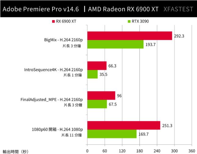 测试主要以视频输出时间来进行比较,可见Premiere Pro分别调用NVIDIA H.264与AMD H.264进行GPU编码加速,而实际性能上RTX 3090快于RX 6900 XT。
