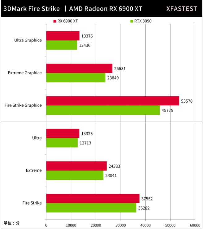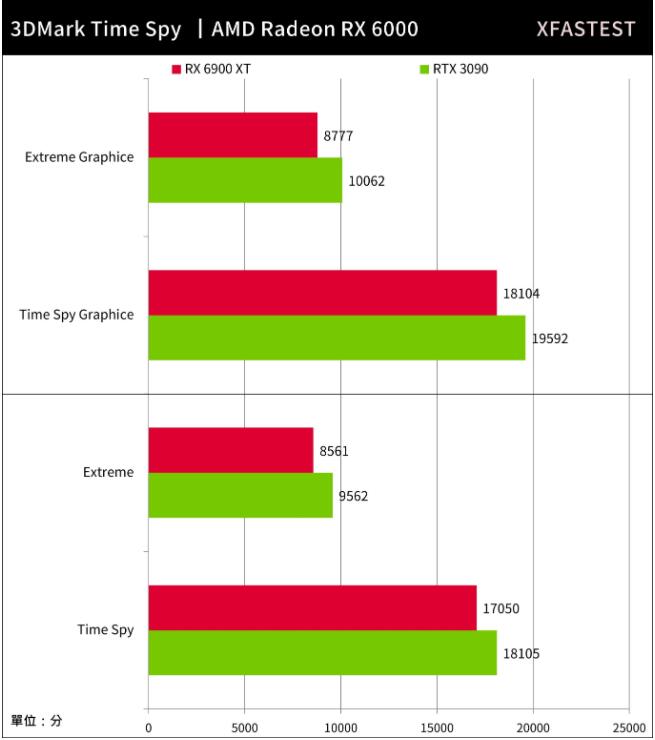 3DMark性能测试,目前主流的DX11 API、Fire Strike测试,RX 6900 XT有着压制RTX 3090的能力,这也显现出高时脉、高缓存的优势;Fire Strike测试中RX 6900 XT对上RTX 3090有着17%、12%与8%的性能领先。