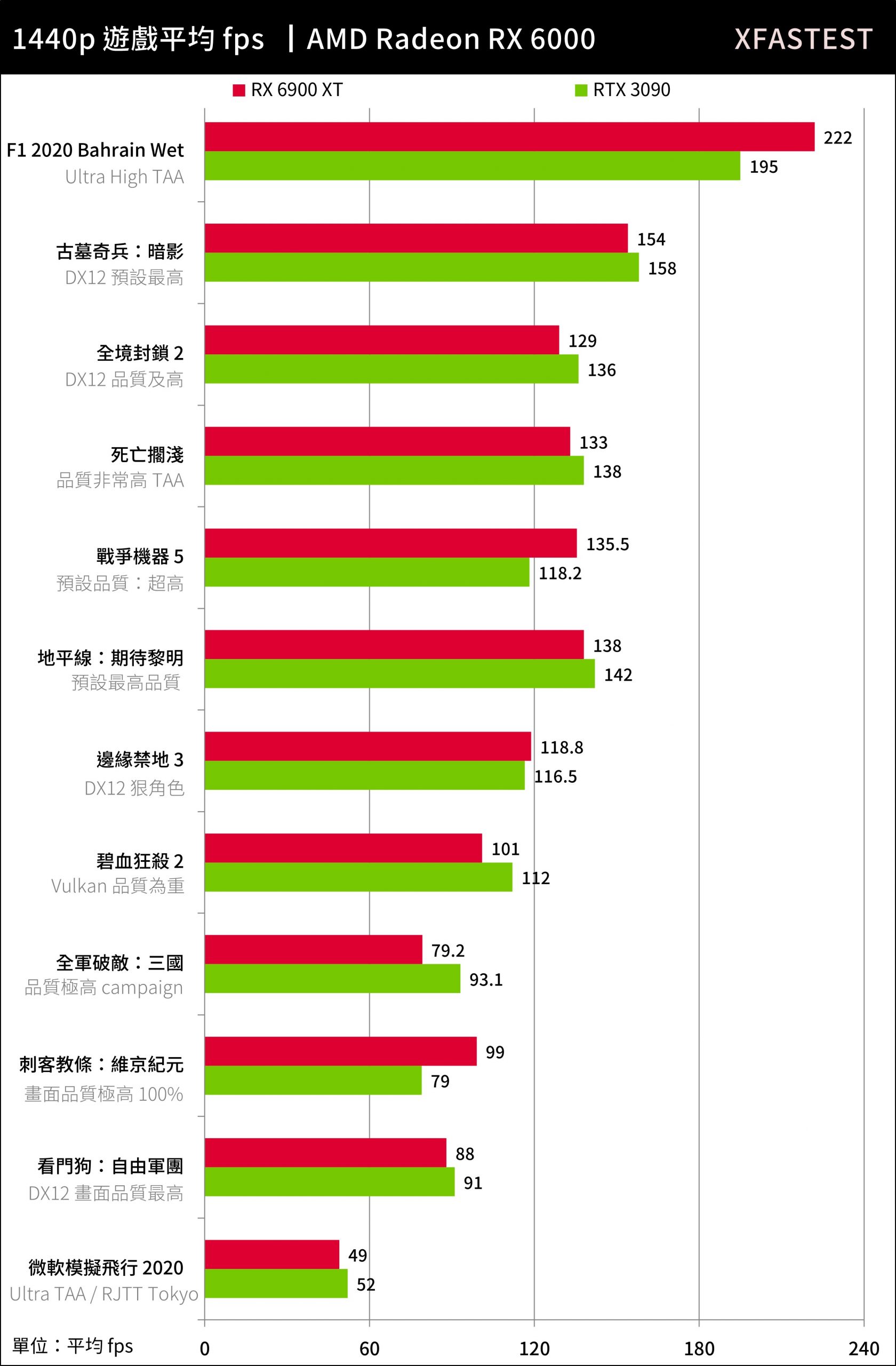 1440p分辨率,RX 6900 XT依然在《Dirt 5》与《Godfall》有着不错的成绩,《战栗深隧:流亡》平均65 FPS、《战地风云V》平均68 FPS,但除此之外的光追游戏《控制》平均33 FPS、《看门狗:自由军团》平均45 FPS,势必要降低特效才能顺畅游玩了。