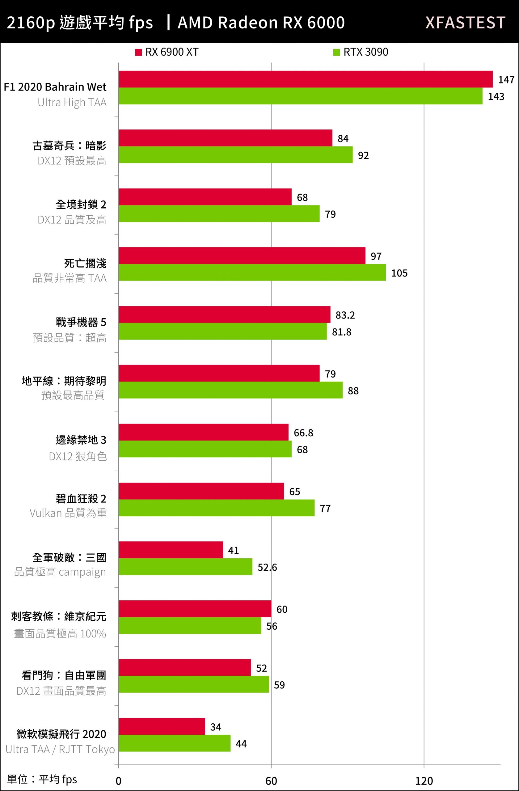 4K、2160p分辨率的主战场,RX 6900 XT都能满足大部分AAA游戏4K60fps以上的性能需求,即便吃资源的《碧血狂杀2》平均65 FPS、《刺客教条:维京纪元》平均60 FPS,但也是有效能较低的游戏像是《全军破敌:三国》、《微软模拟飞行2020》等。