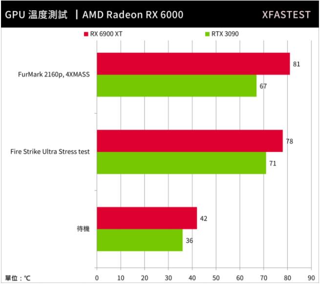 首先GPU温度方面,RX 6900 XT最高来到81°C,在同样尺寸下比RX 6800 XT高了4°C,虽然比RTX 3090的温度高,但算一算这两张卡尺寸的差异,这代Navi 21 GPU的温度表现已相当不错,若是自制卡压在65°C左右也不成问题。