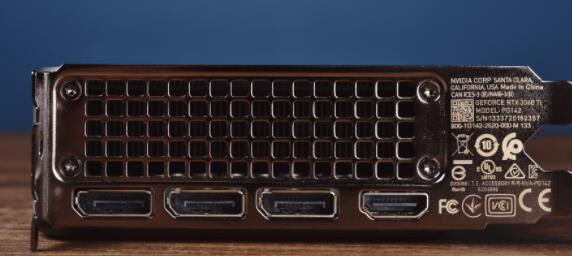 显卡的制造商、产地、安规等信息,创始版都直接雕在档板上;RTX 3060 Ti提供1个HDMI 2.1与3个DisplayPort 1.4a输出。
