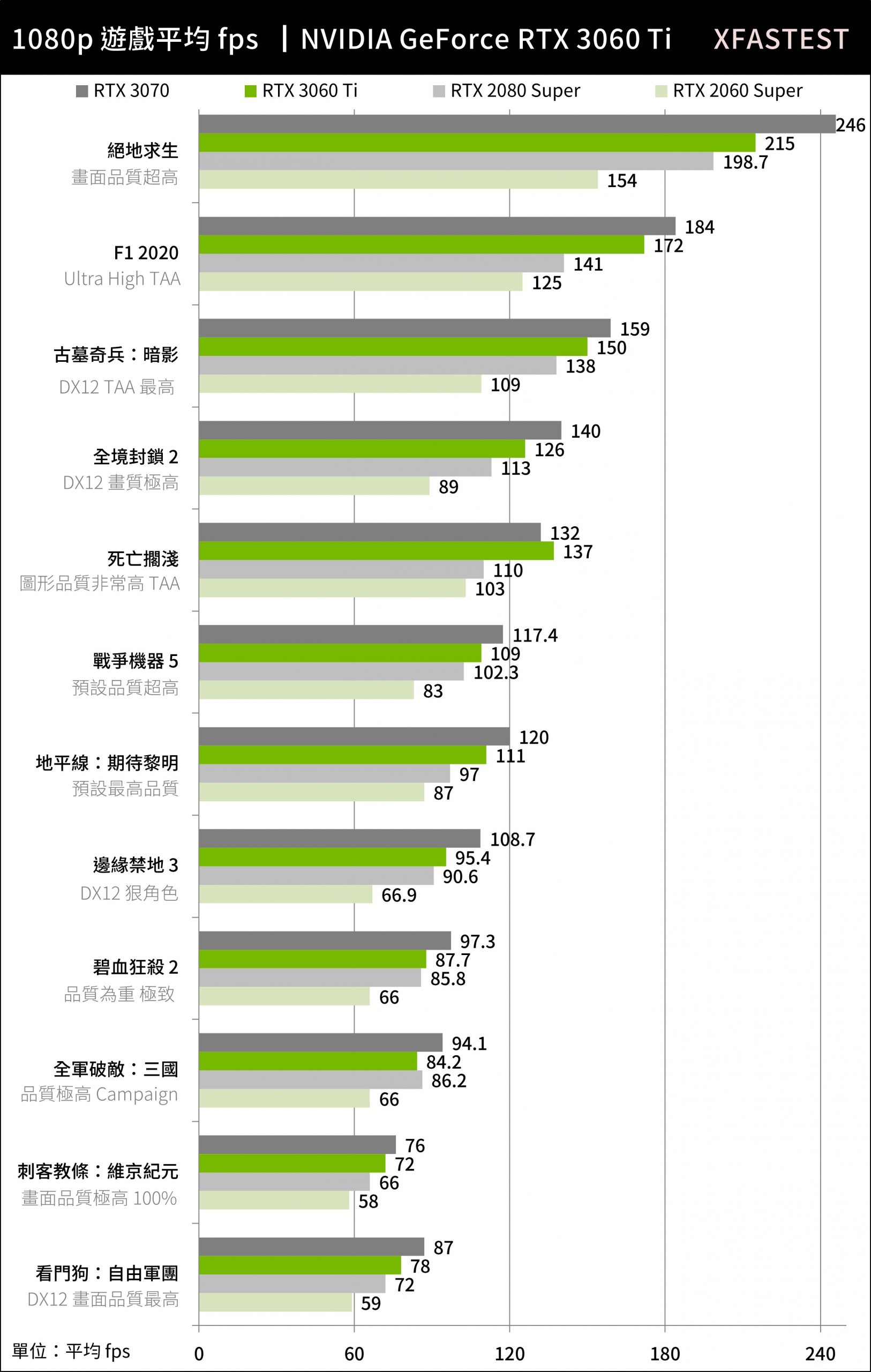 首先1080p分辨率,上述12款游戏RTX 3060 Ti都有着不错的性能,大部分游戏都能维持在平均100 FPS以上的性能,但即便吃资源的《碧血狂杀2》平均87.7 FPS、《全军破敌:三国》平均84.2 FPS、《刺客教条:维京纪元》平均72 FPS、《看门狗:自由军团》平均78 FPS的性能表现。