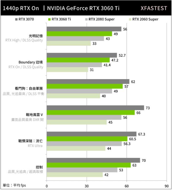 RTX 3060 Ti在1080p分辨率有着相当好的光追性能,《控制》质量光追高/超高取样下有着平均94 FPS、《看门狗:自由军团》在DLSS平衡下也有着平均73 FPS的性能表现;即便分辨率提升到1440p之下也有着相较于上一代更好的光追、DLSS游戏性能表现。