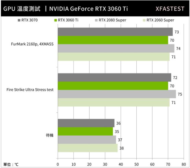首先GPU温度方面,RTX 3060 Ti最高来到730C,对比同散热器的RTX 3070还要低,倘若希望GPU温度能降到65°C左右则要期待自制卡的版本。