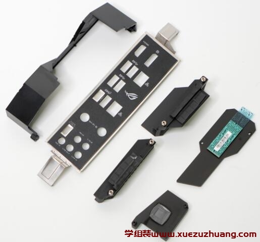 拆下的马甲护盖、I/O档板、两组VRM散热器含导热胶条、M.2散热器含导热胶条。