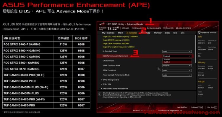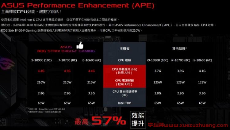 Intel没K也可以超频欧!ASUS Performance Enhancement让你实现超频梦想,只要进入BIOS打开APE就可以超频,目前支持ROG STRIX、TUF GAMING B460、H470系列主板,功耗解放范围125W–210W(视型号)。