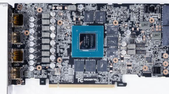 PCB正反面一览,初技嘉在这回导入全自动化制程设计,RTX 3070系列当然也不例外,可以看到板卡上在以往会使用的DIP形式的电容皆已改为SMD形式,并且料件上在GPU供电的MOSFET元件全采高整合的DrMOS元件用料,带给创作者最佳的用料与稳定性。