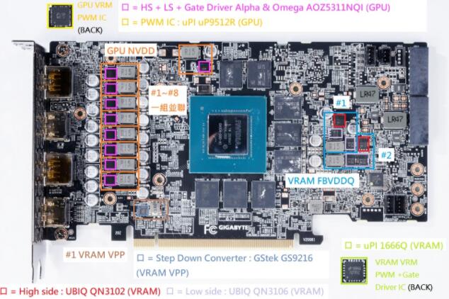 VRAM的部分同时在主要FBVDDQ/VDD为2相,PWM控制器与Gate Driver采用uPI UP1666Q整合型IC,每相晶体采用uPI UBIQ QN3102与QN3106 1H2L的配置,并同样也是于后方串接APAQ 5Khr 820µF后端输出滤波固态电容与0.15µH电感,另外VRAM VPP则是1相供电位于左下方,由单枚GStek GS9216的Step Down Converter IC元件提供。