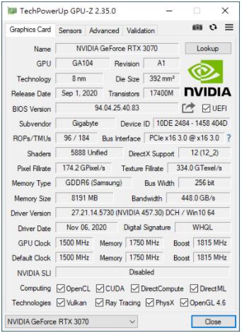 GPU-Z截图,可以看到RTX 3070的详细信息。采用Ampere构架的GA102核心芯片、制程为8 nm,Cuda核心数量为5888个,显示內存则为三星GDDR6 256-Bit 8191 MB。在时脉方面,预设核心时脉为1500 MHz、Boost时脉可达1815 MHz、內存时脉为1750 MHz。