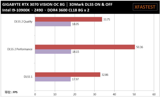 3DMark同时也有着NVIDIA DLSS feature test的测试项目,我们这回测试4K(2160p)的分辨率,测试项目包含DLSS 1、DLSS 2 Performance、DLSS 2 Quality,并比较关闭与开启的性能差异。