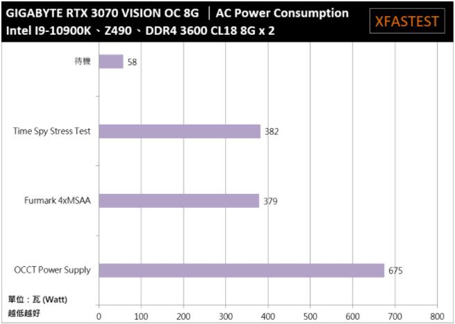 在温度测试下,烧机最高温为67度。整体温度上表现的算是很不错。在功耗方面单纯对显卡进行负载最高为382W,整机功耗为675W。虽然官方是建议650W即可,但如果搭配高阶的CPU,例如本次的I9-10900K并有解锁PL了话,情况允许还是建议各位搭配至少750W以上、大厂可靠的电源供应器。