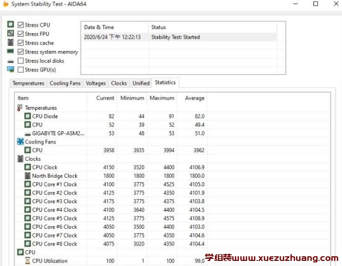 烧机60分钟,CPU Die平均温度来到82度,CPU预设频率,全核烧机频率在4100MHz附近。