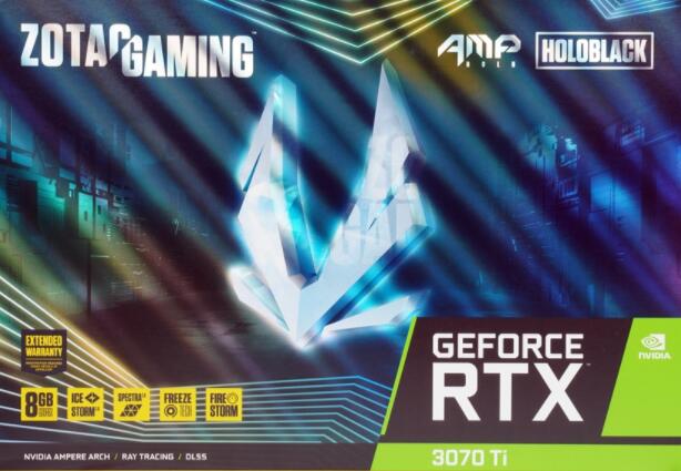 这次开箱的款式为ZOTAC GAMING的GeForce RTX 3070 Ti AMP Holo显卡,与上次开箱的RTX 3080 Ti同为县卡中高阶的AMP Holo系列,在外观上采用独特的设计展现了RTX 30系列「全息极光投影」的设计语汇,并可搭配SPECTRA 2.0 ARGB灯效来达到最好的视觉效果,而在性能方面将RTX 3070 Ti核心Boost时脉提升至1830 MHz,如果玩家还想额外超频也可直接透过FireStorm软件调整,另外散热器部分使用IceStorm 2.0冷却系统,可以确保在高时脉长时间运作下有可靠的散热表现。