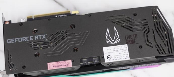 在背面部分可以看到采用金属背板覆盖,在RTX 3070 Ti AMP Holo上可以看到使用的设计就与RTX 30870 Ti AMP Holo不同,在这块金属背板上可以看到靠后侧有大面积的开孔设计,对于散热表现有些许帮助,而在Logo部分为发光设计,与侧边同为ARGB,不过因为面积较小的关系,颜色流动效果并不是特别明显。
