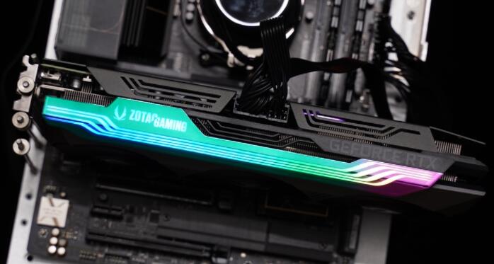 另外论外观来说,ZOTAC GAMING在AMP Holo上真的做出了很有特色的外观,使用渐镀的表面处理在侧边发光模块,视觉上相当有特色及记忆点,只能说美中不足的地方就是渐镀表面非常吃光线反射,如果是水平安装会看不太出来电镀的感觉,如果垂直安装在有足够光线的情况下,整体不论开不开灯效都会有不错的视觉效果。