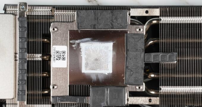 在散热器部分采用三风扇的散热设计,三颗风扇为11叶的风扇带动气流,下方为约2 Slot厚的铝鳍片,鳍片由6根热导管贯穿,其中包含1根「U」型热导管及5根「S」型热导管,所有热导管的一端透过均热板与核心芯片接触,周围则有导热贴片与內存颗粒接触帮助內存与Mosfet散热,另外在金属背板后方也有导热贴片帮內存与Mosfet加强散热。