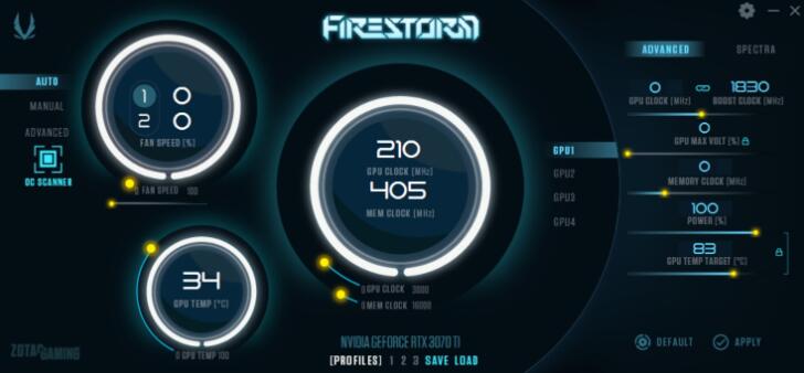 FireStorm软件提供了显卡超频、风扇调整、灯效设定及硬件监控等功能,在超频方面除了手动超频之外,OC Scanner功能可以依据每一张显卡,自动调教出最佳的超频模式,让玩家可以真正使用到显卡最大且稳定的性能,而SPECTRA灯效设定也可以在软件中设定,并且可以将侧边及背板的灯效分开或同不控制。