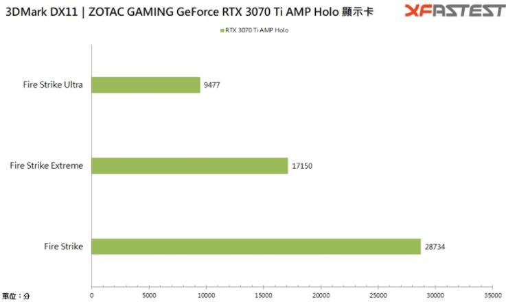 3DMark为模拟3A级游戏绘图运算的性能测试软件,其中Fire Strike系列是模拟DX11游戏运行的情况,在FHD分辨率的Fire Strike测试中,ZOTAC GAMING GeForce RTX 3070 Ti AMP Holo的分数获得了28,734分;2K分辨率的Fire Strike Extreme测试中,获得了17,150分;4K分辨率的Fire Strike Ultra测试中,获得了9,477分。
