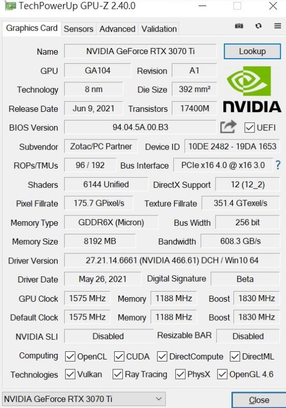 首先可以在GPU-Z中看到显卡的基本信息,ZOTAC GAMING GeForce RTX 3070 Ti AMP Holo采用8 nm的GA104核心芯片,并有着6144个Cuda核心,內存则为Micron GDDR6 256-Bit 8192 MB,在时脉方面,核心时脉为1575 MHz、Boost时脉为1830 MHz、內存时脉为1188 MHz,PCI频宽支持PCIe 4.0 x16,不过因为笔者测试使用i9-10900K处理器,因此测试以PCIe 3.0 x16运行。