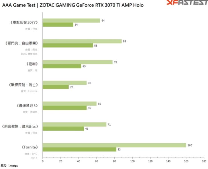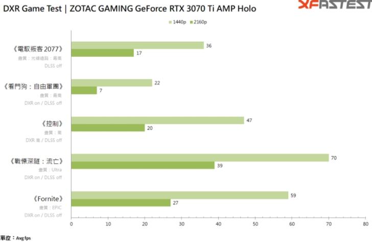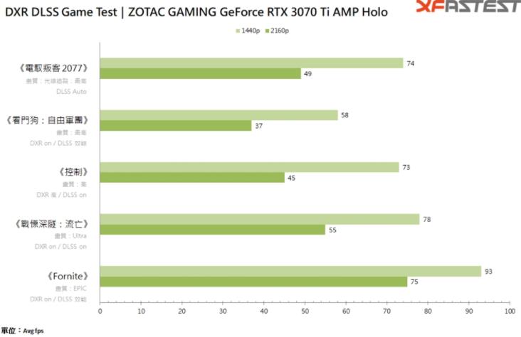 在光追游戏方面采用《电驭叛客2077》、《看门狗:自由军团》、《控制》、《战栗深邃:流亡》及《Fornite》这几款游戏,测试分为只开光追、光追与DLSS同时开启两种,特效设定皆为预设中最高,并以1440p及2160p进行测试。