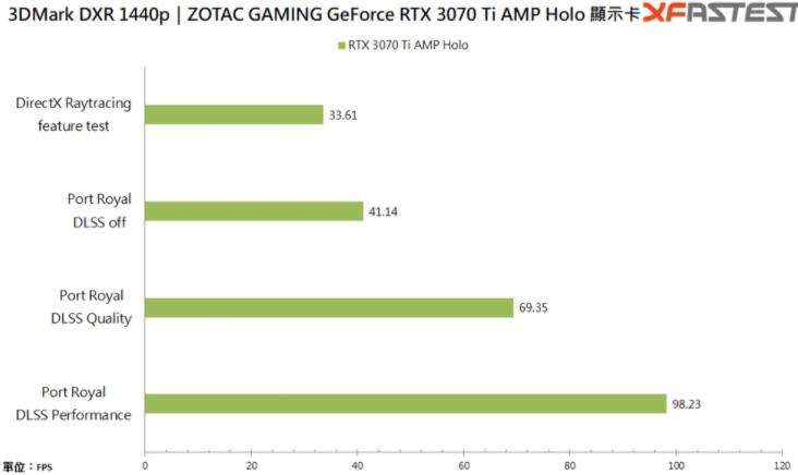 而Port Royal模拟游戏情境还有DirectX Raytracing功能测试及NVIDIA DLSS功能测试,在DirectX Raytracing功能测试中,做纯光线追踪下的性能测试,表现约33 FPS,而NVIDIA DLSS功能测试以1440p分辨率,在没开启DLSS之下为41 FPS,Quality模式下能提升至69 FPS,在Perfprmance模式下更能提升至98 FPS。