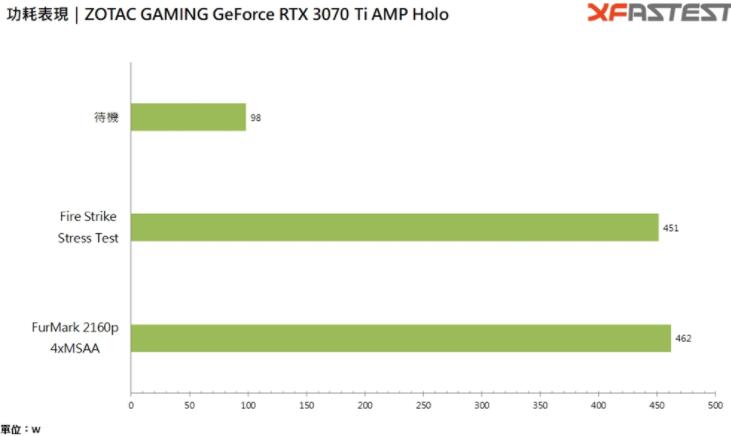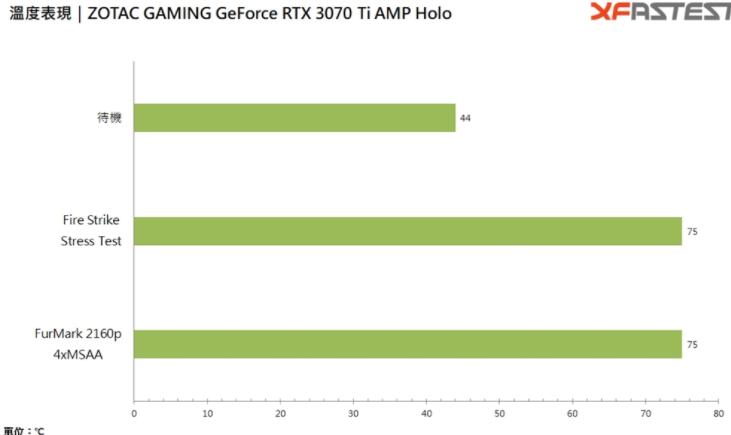 温度与功耗测试以整平台最高数值为主,搭配的是i9-10900k处理器,透过FurMark、Fire Strike Stress Test、GPU-Z,模拟高负载、游戏及待机等情况下的温度及功耗。RTX 3070 Ti AMP Holo待机时由于有风扇低温停转设定,温度较高来到44度,功耗部分则是98 W;压力测试下温度最高都来到75度,在散热方面表现还算可以,功耗部分可达462W,基本上照原厂标示配750W以上电供即可。