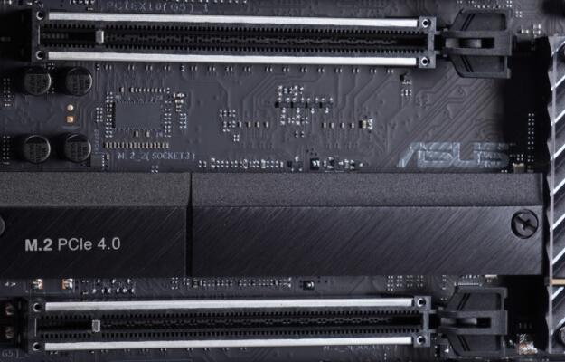 在PCIe 5.0信道部分分配,ProArt Z690-CREATOR相对于ROG Strix Z690-E来的合理许多,ProArt Z690-CREATOR主板上提供了3个PCIe x16插槽,上方两个插槽有金属装甲包覆,为PCIe 5.0 X16插槽,能提供x16或x8/x8的信道组合,下方则是PCH提供的PCIe 3.0插槽,虽然插槽本身是x16长度,但最高只支持x4模式。
