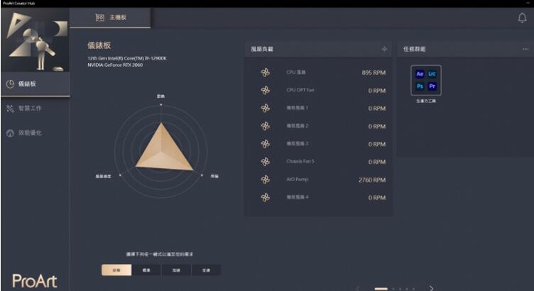 这次ProArt主板在软件部分提供了ProArt Creator Hub,软件中仪表板页面提供了数据监控功能,同时也整合了一些风扇控制设定方便玩家快速调整,而智慧工作页面则是提供了程序快捷设置,另外在性能优化页面提供了多种网络模式的优化。