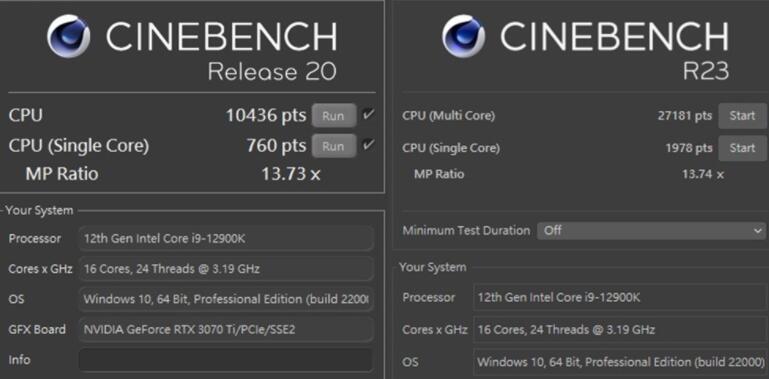 Cinebench主要测试CPU的图象渲染,Cinebench R20有着复杂的场景,并加入了光线追踪运算,测是结果Intel Core i9-12900K单核心运算为760 pts、多核心运算为10436 pts。新版的Cinebench R23测是结果,Intel Core i9-11900K单核心运算为1978 pts、多核心运算为27181 pts。