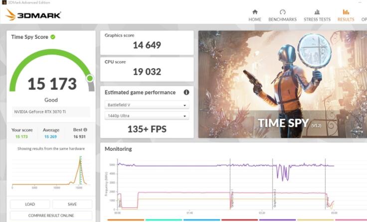 在3DMark游戏性能模拟测试中,Time Spy DX12游戏模拟测试中,CPU分数获得19,032分。