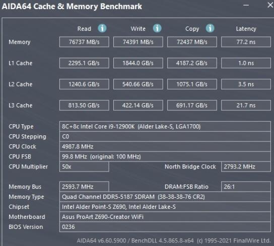 透过AIDA64缓存与內存测试,采用2条DDR5內存@ 5200 MHz,內存读取速度为76737 MB/s、写入速度为74391 MB/s、复制速度则是72437 MB/s,而延迟为77.2 ns。