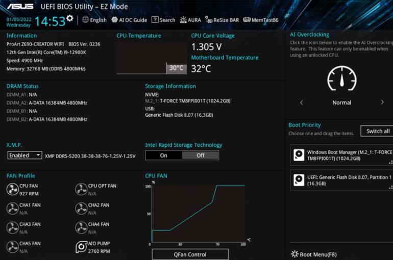 这次ASUS ProArt Z690-CREATOR WIFI搭配12代i9-12900K处理器、XPG LANCER DDR5內存进行性能测试,处理器部分设定于Bios中开启「AI最佳化」超频,內存部分则是开启Intel XMP调整至5200MHz。