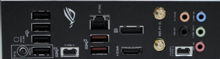 预先安装I/O护板,ROG信仰超便利,护板上的功能有BIOS FlashBack按钮、USB 2.0、USB 3.2 Gen 2含Type-C、有线网络、DisplayPort 1.2、HDMI 2.1、Wi-Fi 6无线网络天线接口、音效接口和Type-C音效。