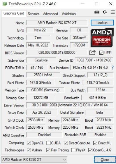 GPU-Z检视AMD Radeon RX 6750 XT完整信息,采用7nm制程的Navi 22 GPU,有着2560个流处理器,以及12GB GDDR6內存,而GPU预设时脉2533 MHz、Boost 2623 MHz,显卡使用PCIe 4.0 x16界面频宽,驱动版本则是Adrenalin 22.10,并开启Resizable BAR。