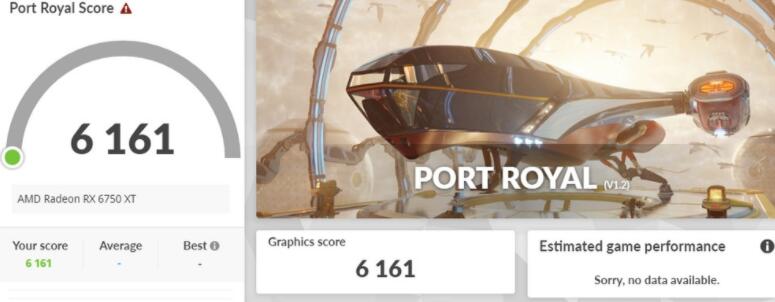 针对光线追踪测试,3DMark Port Royal在AAA游戏中的场景中加入光追DXR应用等技术,RX 6750 XT达到6161分、FPS 28.53的成绩。