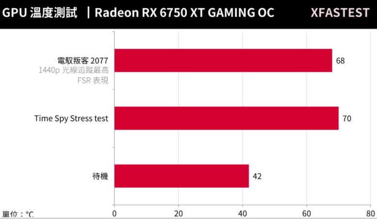 GPU温度方面,RX 6750 XT GAMING OC在风之力3扇压制下,游戏时温度最高仅70°C,这散热表现可说是相当不错,而待机时支持0dB风扇因此温度维持在42°C。