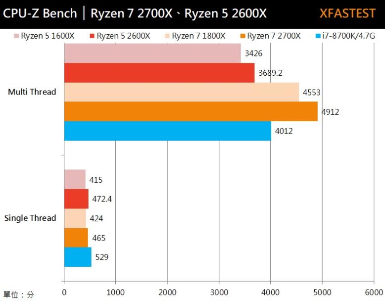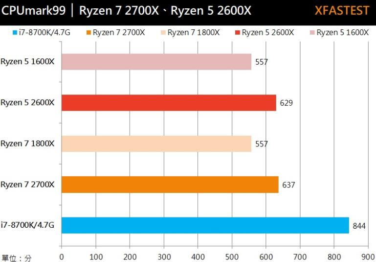 CPUmark99测试,单看处理器的单核心执行能力,单核心的IPC、时脉高即可获得相当高分。这一代R7 2700X与R5 2600X在单核心性能上都上一代提升了14%、12%的性能。