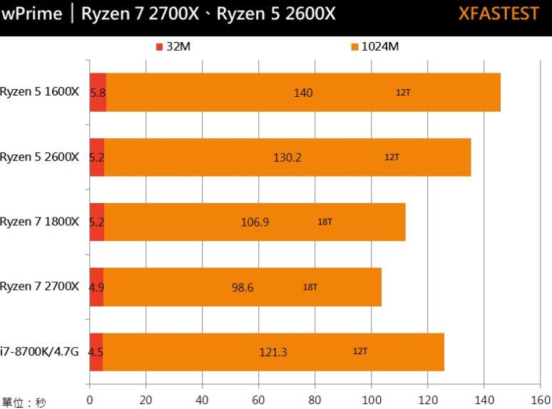 本次测试都以各处理器最大线程来进行测试,于32M测试还是由更快的核心速度的i7-8700K以4.5秒夺冠;而1024M测试,则由更多核心、时脉提升的R7 2700X以98.6秒完成计算,比起上一代1800X还要快了8.3秒,至于R5 2600X则比上一代快了10秒左右。