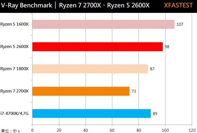 V-Ray Benchmark可分别测试电脑的CPU与GPU,对光线追踪的渲染图象的运算速度,评分为计时以秒为单位。这测试结果与Corona Benchmark相似,R7 2700X只需73秒完成计算,而超频的i7-8700K则需89秒;R5 2600X则需98秒。