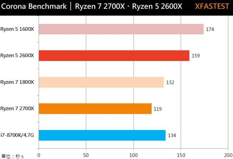 Corona Benchmark则是相当容易操作的测试工具,主要是透过CPU运算光线追踪的渲染图象,评分为计时以秒为单位。从测试结果来看,R7 2700X只需119秒完成计算,更比超频的i7-8700K还要快上许多;R5 2600X则需159秒计算,亦比上一代还要在快。