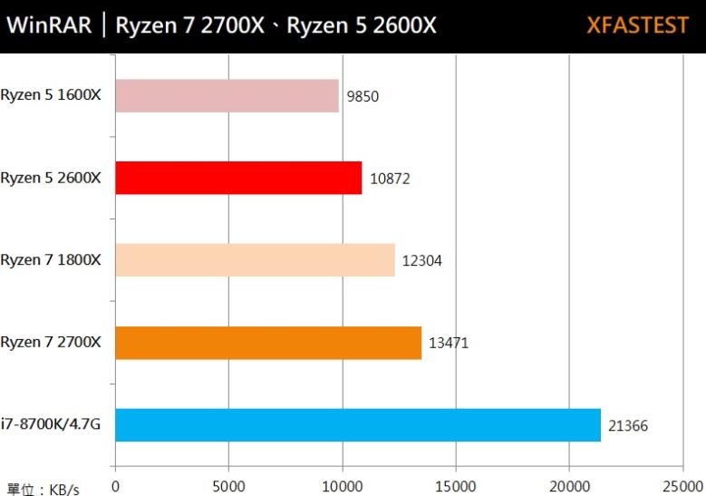 WinRAR压缩测试,R7 2700X有着13471 KB/s之计算速度,而R5 2600X则有着10872 KB/s计算速度,但这性能还是i7-8700K有着21366 KB/s之计算速度要快。