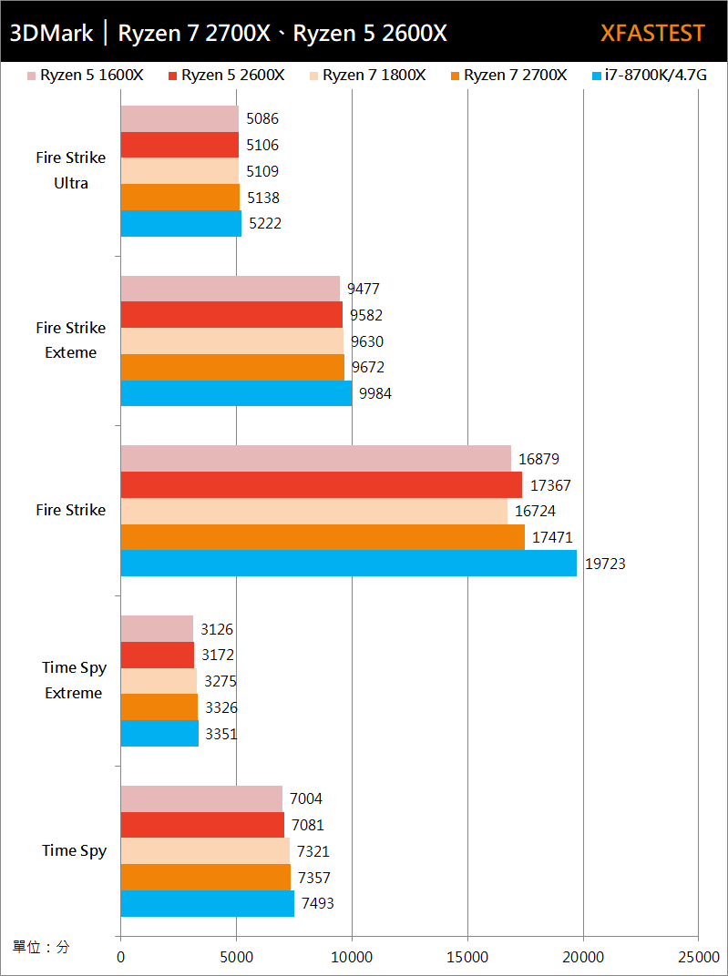 而Time Spy则是AAA、DX12游戏性能测试,可见i7-8700K与R7 2700X在这项目的差距极小,也说明了以往DX11游戏,相对看重高速的2-4颗核心,无法妥善运用多核心处理器的价值。