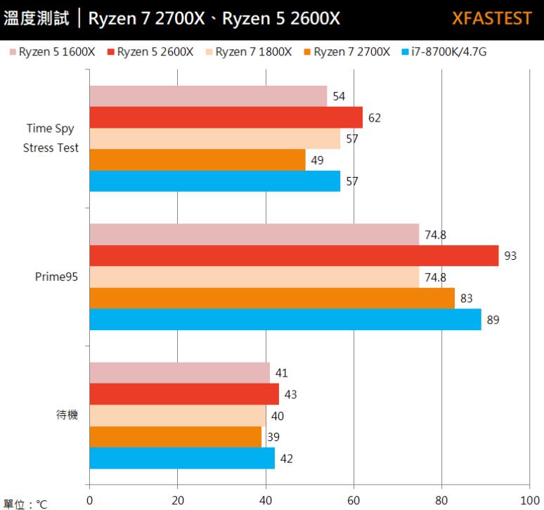 因此温度表现上可能略有高低,但从下方测试来看,待机普遍都在40°C左右的温度,而透过Time Spy Stress Test模拟运行游戏时的测试,R7 2700X温度仅49°C,比起相同散热器的R7 1800X的57°C还要低。